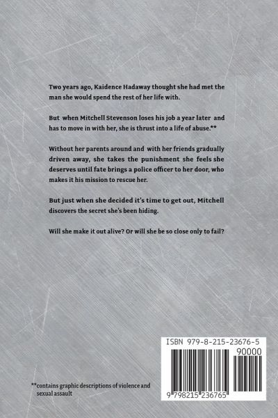 Two years ago, Kaidence Hadaway thought she had met the man she would spend the rest of her life with. But when Mitchell Stevenson lost his job a year later and has to move in with her, she is thrust into a life of abuse. Without her parents around and with her friends gradually driven away, she takes the punishment she feels she deserves until fate brings a police officer to her door, who makes it his mission to rescue her.But just when she decided it's time to get out, Mitchell discovers the secret she's been hiding. Will she make it out alive? Or will she be so close only to fail?