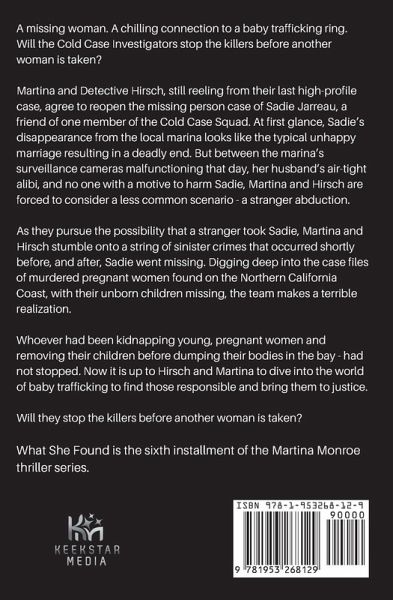 A missing woman. A chilling connection to a baby trafficking ring. Will the Cold Case Investigators stop the killers before another woman is taken? Martina and Detective Hirsch, still reeling from their last high-profile case, agree to reopen the missing person case of Sadie Jarreau, a friend of one member of the Cold Case Squad. At first glance, Sadie's disappearance from the local marina looks like the typical unhappy marriage resulting in a deadly end. But between the marina's surveillance cameras malfunctioning that day, her husband's air-tight alibi, and no one with a motive to harm Sadie, Martina and Hirsch are forced to consider a less common scenario - a stranger abduction. As they pursue the possibility that a stranger took Sadie, Martina and Hirsch stumble onto a string of sinister crimes that occurred shortly before, and after, Sadie went missing. Digging deep into the case files of murdered pregnant women found on the Northern California Coast, with their unborn children missing, the team makes a terrible realization. Whoever had been kidnapping young, pregnant women and removing their children before dumping their bodies in the bay - had not stopped. Now Hirsch and Martina must dive into the world of baby trafficking to find those responsible and bring them to justice. Will they stop the killers before another woman is taken? What She Found is the 6th installment of the page-turning and suspenseful Martina Monroe crime thriller series.