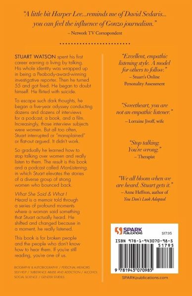Meet a man who actually listens to women. An award-winning investigative journalist tells poignant stories in this compulsively readable memoir, each revealing a profound moment when a woman said something that he actually heard, transforming his life for the better. With more than 50 photos, plus dozens of links to bonus audio and video, each chapter is an immersive experience that grabs hold and does not let go. Stuart Watson spent his first career earning a living by talking. His whole identity was wrapped up in being a Peabody-award-winning investigative reporter. Then he turned 55 and got fired. He began to doubt himself. He flirted with suicide. To escape such dark thoughts, he began a five-year odyssey conducting dozens and dozens of interviews for a podcast, a book, and a film. Increasingly, those interview subjects were women. But all too often, Stuart interrupted or "mansplained" or flat-out argued. It didn't work. So gradually he learned how to stop talking over women and really listen to them. The result is this book and a podcast called ManListening, in which Stuart elevates the stories of a diverse group of strong women who bounced back. What She Said & What I Heard is a memoir told through a series of profound moments where a woman said something that Stuart actually heard. He shifted and changed because in a moment, he really listened. This book is for broken people and the people who don't know how to hear them. If you're still reading, you're one of us.