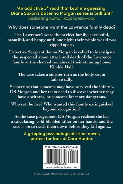 'Crime fiction at its best.' Keri Beevis'An addictive 5* read that kept me guessing. Diane Saxon's DS Jenna Morgan series is brilliant!' Bestselling author, Ross GreenwoodWhy does someone want the Lawrence family dead? The Lawrence's were the perfect family; successful, beautiful, and happy until one night their whole world was ripped apart. Detective Sergeant Jenna Morgan is called to investigate the suspected arson attack and death of the Lawrence family at the charred remains of their stunning home, Kimble Hall. The case takes a sinister turn as the body count fails to tally. Suspecting that someone may have survived the inferno, DS Morgan and her team need to discover whether they have a witness, or someone far more dangerous. Who set the fire? Who wanted this family extinguished beyond recognition? As the case progresses, DS Morgan realises she has a calculating, cold-blooded killer on her hands, and the race is on to track them down before they kill again... A gripping psychological crime novel, perfect for fans of Cara Hunter.