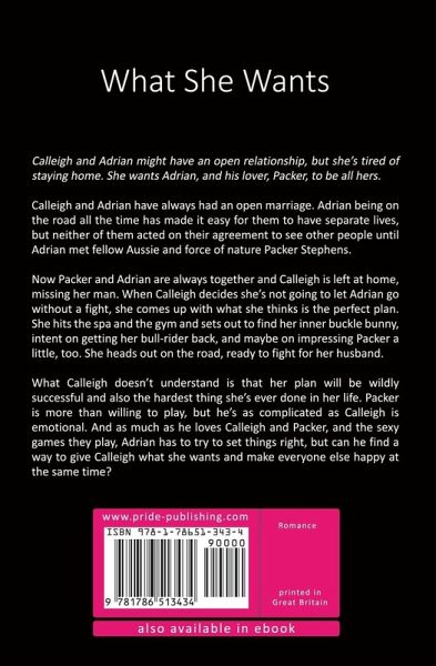 Calleigh and Adrian might have an open relationship, but she's tired of staying home. She wants Adrian, and his lover, Packer, to be all hers. Calleigh and Adrian have always had an open marriage. Adrian being on the road all the time has made it easy for them to have separate lives, but neither of them acted on their agreement to see other people until Adrian met fellow Aussie and force of nature Packer Stephens. Now Packer and Adrian are always together and Calleigh is left at home, missing her man. When Calleigh decides she's not going to let Adrian go without a fight, she comes up with what she thinks is the perfect plan. She hits the spa and the gym and sets out to find her inner buckle bunny, intent on getting her bull-rider back, and maybe on impressing Packer a little, too. She heads out on the road, ready to fight for her husband. What Calleigh doesn't understand is that her plan will be wildly successful and also the hardest thing she's ever done in her life. Packer is more than willing to play, but he's as complicated as Calleigh is emotional. And as much as he loves Calleigh and Packer, and the sexy games they play, Adrian has to try to set things right, but can he find a way to give Calleigh what she wants and make everyone else happy at the same time?