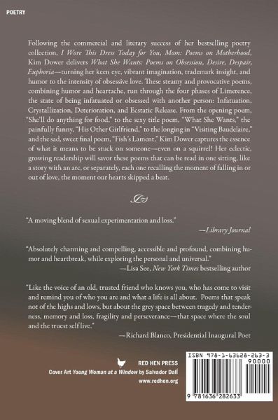 “A witty, sultry, and thoughtful new collection."—Ron Charles, Washington Post Obsessive love has never been so much fun! What She Wants: Poems on Obsession, Desire, Despair, Euphoria is a powerful tribute to the intensity of obsessive love, told through the trademark humor and heartbreak of bestselling poet Kim Dower. Following the commercial and literary success of her bestselling poetry collection, I Wore This Dress Today for You, Mom: Poems on Motherhood, Kim Dower delivers What She Wants: Poems on Obsession, Desire, Despair, Euphoria—turning her keen eye, vibrant imagination, trademark insight, and humor to the intensity of obsessive love. These steamy and provocative poems, combining humor and heartache, run through the four phases of Limerence, the state of being infatuated or obsessed with another person: Infatuation, Crystallization, Deterioration, and Ecstatic Release. From the opening poem, “She’ll do anything for food,” to the sexy title poem, “What She Wants,” the painfully funny, “His Other Girlfriend,” to the longing in “Visiting Baudelaire,” and the sad, sweet final poem, “Fish’s Lament,” Kim Dower captures the essence of what it means to be stuck on someone—even on a squirrel! Her eclectic, growing readership will savor these poems that can be read in one sitting, like a story with an arc, or separately, each one recalling the moment of falling in or out of love, the moment our hearts skipped a beat.