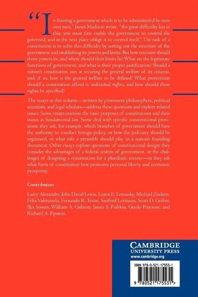 1. What are constitutions, and what should (and can) they do? Larry Alexander; 2. Constitution and fundamental law: the lesson of Classical Athens John David Lewis; 3. Contract, covenant, constitution Loren E. Lomasky; 4. Constitutionalism in the age of terror Michael Zuckert and Peter Valenzuela; 5. The liberal constitution and foreign affairs Fernando R. Tesón; 6. Do constitutions have a point? Reflections on 'parchment barriers' and preambles Sanford Levinson; 7. The origins of an independent judiciary in New York, 1621¿1777 Scott D. Gerber; 8. Foot voting, political ignorance, and constitutional design Ilya Somin; 9. Pluralist constitutionalism William A. Galston; 10. Deliberative democracy and constitutions James S. Fishkin; 11. The constitution of nondomination Guido Pincione; 12. Can we design an optimal constitution? Of structural ambiguity and rights clarity Richard A. Epstein.