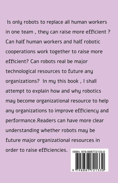 Robots had been organizational internal one kind of main technological resources to be used. Some manufacturers had chosen robots to replace human workers to do simple or complex tasks in order to raise efficiency. How to use robots to help organizations to raise efficiencies or improve performance. Is only robots to replace all human workers in one team , they can raise more efficient ? Can half human workers and half robotic cooperations work together to raise more efficient? Can robots real be major technological resources to future any organizations? In my this book , I shall attempt to explain how and why robotics may become organizational resource to help any organizations to improve efficiency and performance.Readers can have more clear understanding whether robots may be future major organizational resources in order to raise efficiencies.