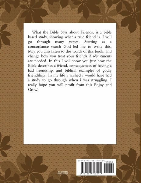 What the Bible Says about Friends, is a bible based study, showing what a true friend is. I will go through many verses. Starting as a concordance search God led me to write this. May you also listen to the words of this book, and change how you treat your friends if adjustments are needed. In this I will show you just how the Bible describes a friend, consequences of having a bad friendship, and biblical examples of godly friendships. In my life i wished i would have had a study to go through when i was struggling. I really hope you will profit from this Enjoy and Grow!