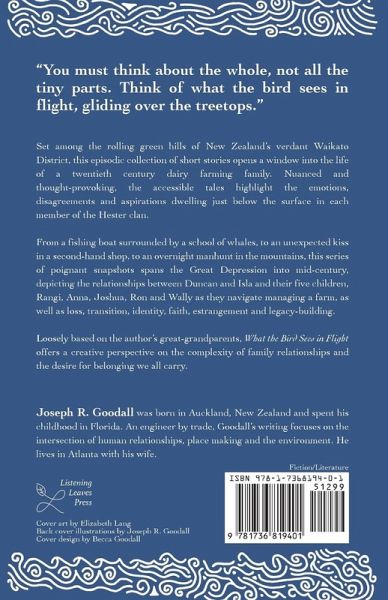 Set among the rolling green hills of New Zealand's verdant Waikato District, this episodic collection of short stories opens a window into the life of a twentieth century dairy farming family. Nuanced and thought-provoking, the accessible tales highlight the emotions, disagreements and aspirations dwelling just below the surface in each member of the Hester clan. From a fishing boat surrounded by a school of whales, to an unexpected kiss in a second-hand shop, to an overnight manhunt in the mountains, this series of poignant snapshots spans the Great Depression into mid-century, depicting the relationships between Duncan and Isla and their five children, Rangi, Anna, Joshua, Ron and Wally, as they navigate managing a farm, as well as loss, transition, identity, faith, estrangement and legacy-building. Loosely based on the author's great-grandparents, What the Bird Sees in Flight offers a creative perspective on the complexity of family relationships and the desire for belonging we all carry. --- Joseph R. Goodall was born in Auckland, New Zealand and spent his childhood in Florida. An engineer by trade, Goodall's writing focuses on the intersection of human relationships, place making and the environment. He lives in Atlanta with his wife.