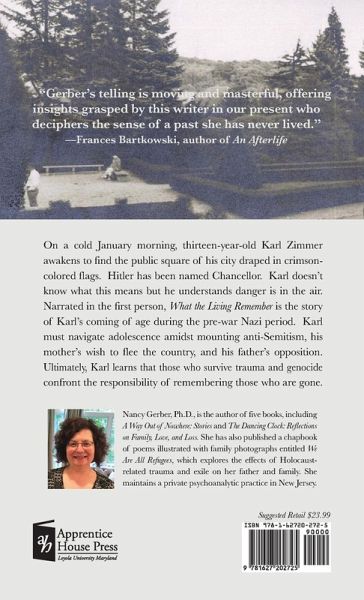 On a cold January morning, thirteen-year-old Karl Zimmer awakens to find the public square of his city draped in crimson-colored flags. Hitler has been named Chancellor. Karl doesn't know what this means but he understands danger is in the air. Narrated in the first person, What the Living Remember is the story of Karl's coming of age during the pre-war Nazi period. Karl must navigate adolescence amidst mounting anti-Semitism, his mother's wish to flee the country, and his father's opposition. Ultimately, Karl learns that those who survive trauma and genocide confront the responsibility of remembering those who are gone.