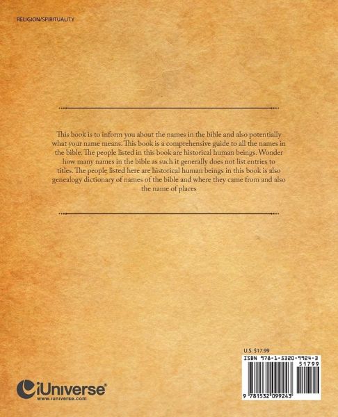 This book is to inform you about the names in the bible and also potentially what your name means. This book is a comprehensive guide to all the names in the bible. The people listed in this book are historical human beings. Wonder how many names in the bible as such it generally does not list entries to titles. The people listed here are historical human beings in this book is also genealogy dictionary of names of the bible and where they came from and also the name of places