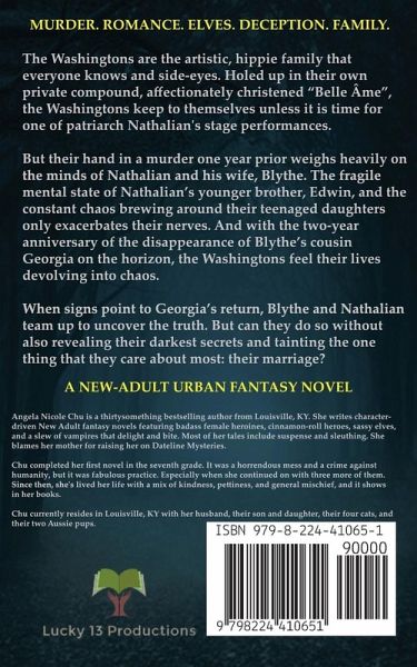 They committed a murder. They just wanted to find their missing cousin. Someone knows the truth and wants them dead... In a world where elves and humans coexist, the Washingtons are more than just the artistic, hippie family next door. Beneath their artistic façade lies a web of secrets, including their involvement in a year-old murder and the mysterious disappearance of Blythe's cousin, Georgia. Thrust into a web of deception and hidden truths, Blythe and Nathalian must navigate the intricate tapestry of their elven heritage and the human world. But as the family grapples with the fragile mental state of Nathalian's brother Edwin and the whirlwind of their teenage daughters' lives, signs emerge hinting at Georgia's unexpected return. And she is not happy. Unravelling Georgia's fate means delving deep into a labyrinth of urban fantasy and mystery. But in their quest for answers, Blythe and Nathalian risk exposing their darkest secrets and endangering the very essence of their marriage. Will the Washingtons' pursuit of truth save them, or will it plunge them further into chaos? "A very refreshing plot without predictable "twists" like your typical mystery/detective novels" -- Britt, Eyes Open Reviews "As soon as I finished, I immediately wanted to start over from the beginning and watch the pieces of the puzzle fall into place." -- L.E. Wright, author of Other Realms