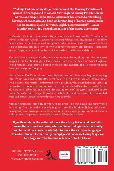 In October 1925, four New York City jazz musicians known as The Troubadours travel to the neo-Gothic Halcyon Castle near Gloucester, MA, home of occultist Duncan Fox, to perform a week-long series of entertainments. Halloween is Fox's fiftieth birthday and he's invited twelve family members and friends--including an astrologer, a tarot card reader, and a wizard--to celebrate with him. The activities at Halcyon Castle, however, prove to be anything but what its name suggests. On the first night a Ouija board predicts the death of Fox's longtime friend Natalie Talbot from a heroin overdose. Her husband insists she never used drugs and suspects foul play. Lizzie Crane, The Troubadours' beautiful and talented chanteuse, begins snooping into the unexplained death after local police place her and her colleagues under house arrest. She learns the deceased was a medium, who swindled many grieving people by pretending to communicate with their departed loved ones on the Other Side. Natalie Talbot also made enemies among some of the guests gathered at the castle. Soon the list of suspects grows to include the medium's lover, her cuckolded husband, and several others with vendettas to settle. Natalie's death isn't the only mystery at Halcyon. The castle also has eerie voices emanating from its walls, a resident ghost, peculiar blinking lights, and secret passageways. As Lizzie pursues her quest into the strange goings-on, she discovers a plot to reap vengeance--and risks her own life in the process.