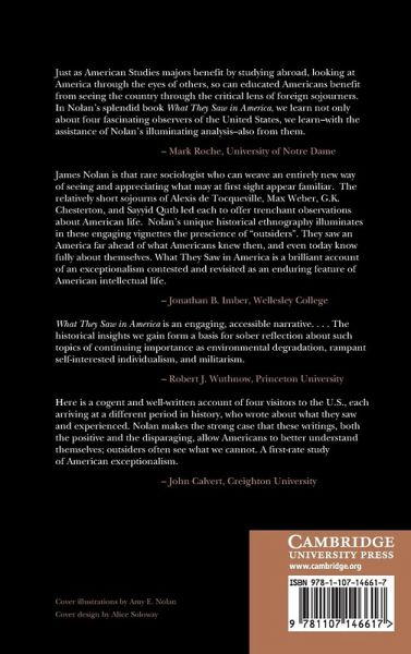 Grounded in the stories of their actual visits, What They Saw in America takes the reader through the journeys of four distinguished, yet very different foreign visitors - Alexis de Tocqueville, Max Weber, G. K. Chesterton and Sayyid Qutb - who traveled to the United States between 1830 and 1950. The comparative insights of these important outside observers (from both European and Middle Eastern countries) encourage sober reflection on a number of features of American culture that have persisted over time - individualism and conformism, the unique relationship between religion and capitalism, indifference toward nature, voluntarism, attitudes toward race, and imperialistic tendencies. Listening to these travelers' views, both the ambivalent and even the more unequivocal, can help Americans better understand themselves, more fully empathize with the values of other cultures, and more deeply comprehend how the United States is perceived from the outside.
