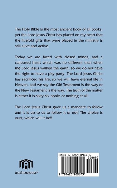 The Holy Bible is the most ancient book of all books, yet the Lord Jesus Christ has placed on my heart that the fivefold gifts that were placed in the ministry is still alive and active. Today we are faced with closed minds, and a calloused heart which was no different than when the Lord Jesus walked the earth, so we do not have the right to have a pity party. The Lord Jesus Christ has sacrificed his life, so we will have eternal life in Heaven, and we say the Old Testament is the way or the New Testament is the way. The truth of the matter is either it is sixty-six books or nothing at all. The Lord Jesus Christ gave us a mandate to follow and it is up to us to follow it or not! The choice is ours; which will it be!!