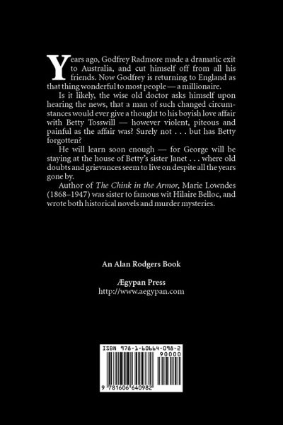 Years ago, Godfrey Radmore made a dramatic exit to Australia, and cut himself off from all his friends. Now Godfrey is returning to England as that thing wonderful to most people -- a millionaire. Is it likely, the wise old doctor asks himself upon hearing the news, that a man of such changed circumstances would ever give a thought to his boyish love affair with Betty Tosswill -- however violent, piteous and painful as the affair was? Surely not . . . but has Betty forgotten? He will learn soon enough -- for George will be staying at the house of Betty's sister Janet . . . where old doubts and grievances seem to live on despite all the years gone by. Author of "The Chink in the Armor," Marie Lowndes (1868-1947) was sister to famous wit Hilaire Belloc, and wrote both historical novels and murder mysteries.