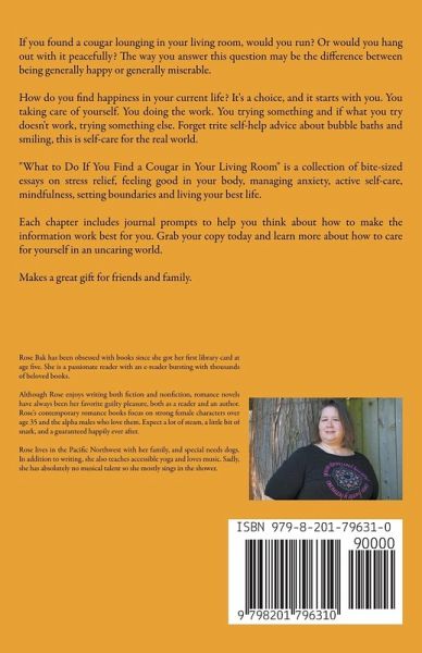 If you found a cougar lounging in your living room, would you run? Or would you hang out with it peacefully? The way you answer this question may be the difference between being generally happy or generally miserable. How do you find happiness in your current life? It's a choice, and it starts with you. You taking care of yourself. You doing the work. You trying something and if what you try doesn't work, trying something else. Forget trite self-help advice about bubble baths and smiling, this is self-care for the real world. "What to Do If You Find a Cougar in Your Living Room" is a collection of bite-sized essays on stress relief, feeling good in your body, managing anxiety, active self-care, mindfulness, setting boundaries and living your best life. Each chapter includes journal prompts to help you think about how to make the information work best for you. Grab your copy today and learn more about how to care for yourself in an uncaring world. Makes a great gift for friends and family.