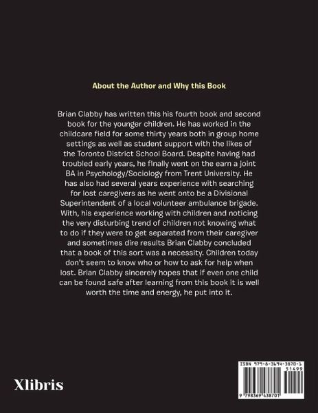 About the Author and Why this Book Brian Clabby has written this his fourth book and second book for the younger children. He has worked in the childcare field for some thirty years both in group home settings as well as student support with the likes of the Toronto District School Board. Despite having had troubled early years, he finally went on the earn a joint BA in Psychology/Sociology from Trent University. He has also had several years experience with searching for lost caregivers as he went onto be a Divisional Superintendent of a local volunteer ambulance brigade. With, his experience working with children and noticing the very disturbing trend of children not knowing what to do if they were to get separated from their caregiver and sometimes dire results Brian Clabby concluded that a book of this sort was a necessity. Children today don't seem to know who or how to ask for help when lost. Brian Clabby sincerely hopes that if even one child can be found safe after learning from this book it is well worth the time and energy, he put into it.