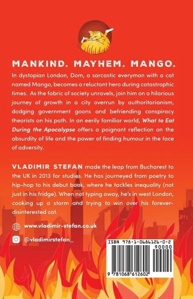 In the heart of a dystopian London, where the air crackles with tension and the streets echo with uncertainty, a reluctant hero emerges. Meet Dom, a laid-back everyman with a penchant for sarcasm and a feline companion named Mango. When catastrophic events plunge the city into darkness, he finds himself on an unexpected journey for survival. As the fabric of society unravels, join Dom on a side-splitting adventure through a city overrun by authoritarianism and existential crises, where unexpected allies and bizarre encounters await around every corner. From dodging government goons to befriending conspiracy theorists with questionable beliefs, Dom's escapades will keep you laughing from start to finish. But amidst the laughter lies a deeper exploration of resilience, transformation, and the human spirit. Through Dom's evolution from apathetic slacker to unlikely hero, What to Eat During the Apocalypse offers a poignant reflection on the absurdity of life and the power of finding humour in the face of adversity.