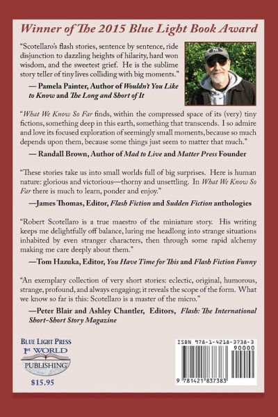 Winner of The 2015 Blue Light Book Award ~ ~~ Robert Scotellaro has been published widely in national and international books, journals and anthologies. He is the author of seven literary chapbooks and several books for children. His story "Fun House" is included in the anthology Flash Fiction International by W.W. Norton. A collection of his flash fiction, Measuring the Distance, was published by Blue Light Press (2012). He was the recipient of Zone 3's Rainmaker Award in Poetry. With Dale Wisely, he co-edits the journal, One Sentence Poems. Raised in Manhattan, he currently lives with his wife in San Francisco.