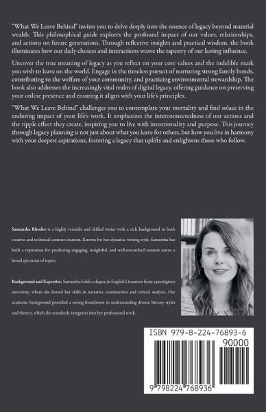 "What We Leave Behind" invites you to delve deeply into the essence of legacy beyond material wealth. This philosophical guide explores the profound impact of our values, relationships, and actions on future generations. Through reflective insights and practical wisdom, the book illuminates how our daily choices and interactions weave the tapestry of our lasting influence. Uncover the true meaning of legacy as you reflect on your core values and the indelible mark you wish to leave on the world. Engage in the timeless pursuit of nurturing strong family bonds, contributing to the welfare of your community, and practicing environmental stewardship. The book also addresses the increasingly vital realm of digital legacy, offering guidance on preserving your online presence and ensuring it aligns with your life's principles. "What We Leave Behind" challenges you to contemplate your mortality and find solace in the enduring impact of your life's work. It emphasizes the interconnectedness of our actions and the ripple effect they create, inspiring you to live with intentionality and purpose. This journey through legacy planning is not just about what you leave for others, but how you live in harmony with your deepest aspirations, fostering a legacy that uplifts and enlightens those who follow.