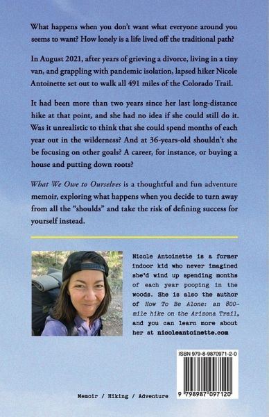 What happens when you don't want the same things that everyone around you seems to want? How lonely is a life lived off the traditional path? In August 2021, after years of grieving a divorce, living in a tiny van, and grappling with pandemic isolation, lapsed hiker Nicole Antoinette set out to walk all 491 miles of the Colorado Trail. It had been more than two years since her last long-distance hike at that point, and she had no idea if she could still do it. Was it unrealistic to think that she could spend months of each year out in the wilderness? At 36-years-old shouldn't she be focusing on other goals? A career, for instance, or buying a house and putting down roots? What We Owe to Ourselves is a thoughtful and fun adventure memoir, exploring what happens when you decide to turn away from all the "shoulds" and take the risk of defining success for yourself instead.