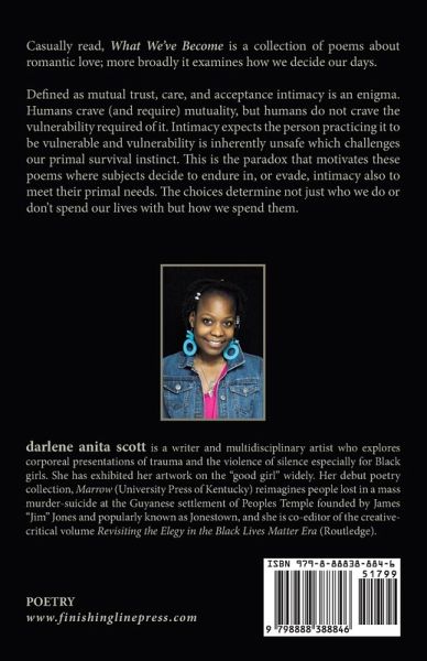 darlene anita scott is a writer and multidisciplinary artist who explores corporeal presentations of trauma and the violence of silence especially for Black girls. She has exhibited her artwork on the "good girl" widely. Her debut poetry collection, Marrow (University Press of Kentucky) reimagines people lost in a mass murder-suicide at the Guyanese settlement of Peoples Temple founded by James "Jim" Jones and popularly known as Jonestown, and she is co-editor of the creative-critical volume Revisiting the Elegy in the Black Lives Matter Era (Routledge).