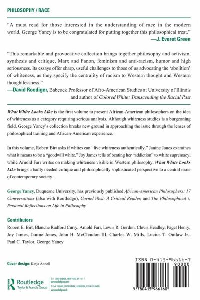 In the burgeoning field of whiteness studies, What White Looks Like takes a unique approach to the subject by collecting the ideas of African-American philosophers. George Yancy has brought together a group of thinkers who address the problematic issues of whiteness as a category requiring serious analysis. What does white look like when viewed through philosophical training and African-American experience? In this volume, Robert Birt asks if whites can live whiteness authentically. Janine Jones examines what it means to be a goodwill white. Joy James tells of beating her addiction to white supremacy, while Arnold Farr writes on making whiteness visible in Western philosophy. What White Looks Like brings a badly needed critique and philosophically sophisticated perspective to central issue of contemporary society.