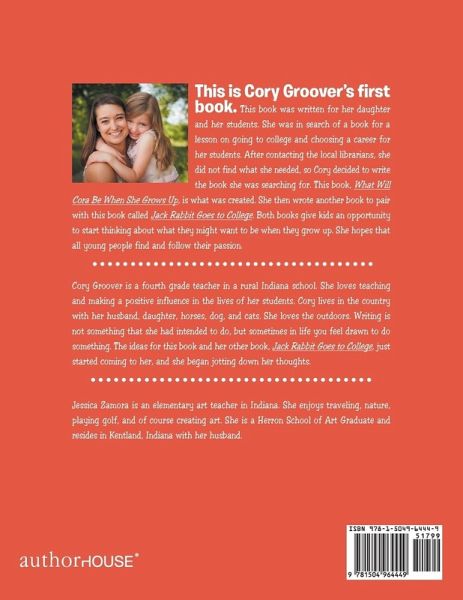 This is Cory Groover's first book. This book was written for her daughter and her students. She was in search of a book for a lesson on going to college and choosing a career for her students. After contacting the local librarians, she did not find what she needed, so Cory decided to write the book she was searching for. This book, What Will Cora Be When She Grows Up, is what was created. She then wrote another book to pair with this book called Jack Rabbit Goes to College. Both books give kids an opportunity to start thinking about what they might want to be when they grow up. She hopes that all young people find and follow their passion.