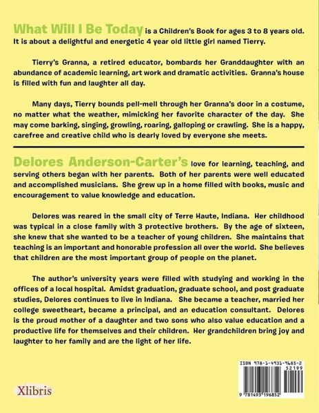 What Will I Be Today is a Children's Book for ages 3 to 8 years old. It is about a delightful and energetic 4 year old little girl named Tierry. Tierry's Granna, a retired educator, bombards her Granddaughter with an abundance of academic learning, art work and dramatic activities. Granna's house is filled with fun and laughter all day. Many days, Tierry bounds pell-mell through her Granna's door in a costume, no matter what the weather, mimicking her favorite character of the day. She may come barking, singing, growling, roaring, galloping or crawling. She is a happy, carefree and creative child who is dearly loved by everyone she meets.