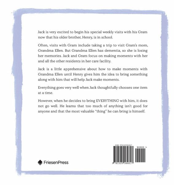 Jack is very excited to begin his special weekly visits with his Gram now that his older brother, Henry, is in school. Often, visits with Gram include taking a trip to visit Gram's mom, Grandma Ellen. But Grandma Ellen has dementia, so she is losing her memories. Jack and Gram focus on making moments with her and all the other residents in her care facility. Jack is a little apprehensive about how to make moments with Grandma Ellen until Henry gives him the idea to bring something along with him that will help Jack make moments. Everything goes very well when Jack thoughtfully chooses one item at a time. However, when he decides to bring EVERYTHING with him, it does not go well. He learns that too much of anything isn't good for anyone and that the most valuable "thing" he can bring is himself.