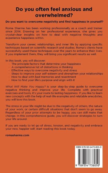 Do you often feel anxious and overwhelmed? Do you want to overcome negativity and find happiness in yourself? Roma Sharma has been working professionally as a coach and trainer since 2014. Drawing on her experience, she gives you crystal-clear insights on how to deal with negative thoughts and experience happiness within. Enhance your career, relationships, and inner life by applying specific techniques based on scientific research and studies. Roma has successfully used these techniques for her clients over the years. If you implement them, they will bring you significant results as well. In this book, you will discover: ¿ The principle factors that determine your happiness ¿ A comprehensive list of distortions in thinking ¿ Effective ways to overcome negativity and stress ¿ Steps to improve your self-esteem and strengthen your relationships ¿ How to deal with bad memories and resentment ¿ How to find your life's purpose and align with it If you like real-life examples and relatable anecdotes about how to be happy, you will love this book. What Will Make You Happy? is your step-by-step guide to overcome negative thinking and transform your life. Complete with practical exercises and tools, it's your route to lasting happiness. The stress in your life might be due to the negativity of others, the nature of your work, or certain difficult situations that don't seem to go away. Regardless of your prior attempts to be happy, you can still make that change. In this comprehensive guide, you will discover strategies to turn your life around. If you are ready to let go of stress, tension, and negativity and embrace your new, happier self, start reading this book today.