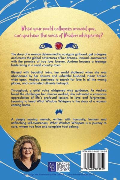 When your world collapses around you, can you hear the voice of Wisdom whispering? The story of a woman determined to navigate girlhood, get a degree and create the global adventures of her dreams. Instead, enamoured with the promise of true love forever, Andrea became a teenage bride living in a small country town. Blessed with beautiful twins, her world shattered when she was abandoned by her abusive and unfaithful husband. Heart broken wide open, Andrea continued to search for love in all the wrong places, and confronted ultimate betrayal. Throughout, a quiet voice whispered wise guidance. As Andrea faced the challenges her choices evoked, she cultivated a conscious appreciation of life's profound lessons in love and forgiveness. Learning to heed What Wisdom Whispers is the story of a woman coming home. A deeply moving memoir, written with humanity, humour and unflinching self-awareness, What Wisdom Whispers is a journey to core, where true love and complete trust belong.