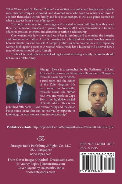 What Women Call 'A Man of Honour' was written as a guide and inspiration to single men, married couples, widowed, and divorced men who want to remarry on how to conduct themselves within family and love relationships. It will also guide women on what to expect from a man of integrity. The book contains notes from single and married women outlining how they want their men of honour (husband or prospective husband) to carry themselves in terms of affection, passion, interests, and demeanour within a relationship. One woman tells how she would want her future husband to emulate the integrity and honour of her father. A reader looking for a husband will learn how her man of honour should present himself. A sample profile has been created for a self-respecting woman looking for a partner. A woman who already has a husband will discover how a man of honour should carry himself. The book is invaluable to a man looking forward to having a family on how he should behave in a relationship. Mlungisi Biyela is a researcher for the Parliament of South Africa and writes on a part-time basis. He grew up in Nongoma, KwaZulu Natal, South Africa, a rural town and the center of the Zulu kingdom. He later moved to Newcastle, KwaZulu Natal. The author now lives and works in Cape Town, the legislative capital of South Africa. This is his published fifth book. "I saw divorce rising and the cause being minor issues that can be resolved by exposure to knowledge on what women want in a relationship." Publisher's website: http://sbprabooks.com/MlungisiBiyelaandWendyBiyela-Khanyile