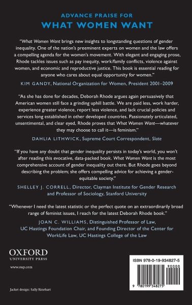 What Women Want is a trenchant examination of the struggle for women's equality, and a prescription for what to focus on next in order to ensure maximum success. Feminism today is a movement that lacks leadership, unity, and definition, and it has gotten stuck in a boom and bust cycle when it comes to public opinion and action. Despite significant progress over the last fifty years, equality is still a distant goal in the political, social, and economic spheres. Only by identifying the barriers (both internal and external) that remain, Deborah Rhode argues, can we begin to identify solutions. A rigorously researched and well-written answer to the glut of gender-related books that have come onto the market recently, What Women Want comprehensively analyzes the challenges the feminist movement faces today. Combining sharp academic analysis and interviews with notable figures such as Sheryl Sandberg, Rhode focuses on five main topics: employment issues such as pay discrimination, work-life balance and the government's pitiful response, the assault on women's reproductive rights and the limits it places on their economic mobility, sexual harassment and violence, and the detrimental effect that the unfashionable label "feminist" can have, especially in attracting young women to the movement. Despite these formidable obstacles, the goals and principles of feminism are widely accepted by the American mainstream, and Rhode, herself a pathbreaker in the fields of law and education, offers effective strategies for redefining and advancing the feminist agenda, thereby creating a movement that truly recognizes, and is responsive to, what all women want.