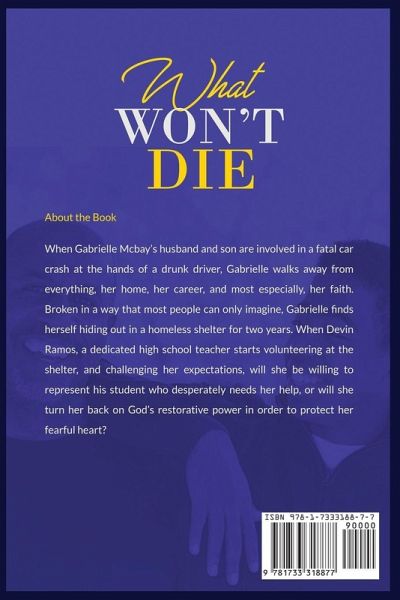 This is a Christian fiction novel When Gabrielle Mcbay's husband and son are involved in a fatal car accident, Gabrielle walks away from everything, her home, her career, and most especially, her faith. Broken in a way that most people can only imagine, Gabrielle finds herself hiding out in a homeless shelter for two years. When Devin Ramos, a dedicated high school teacher starts volunteering at the shelter, and challenging her expectations, will she be willing to represent his troubled student, or will she turn her back on God's restorative power in order to protect her fearful heart?