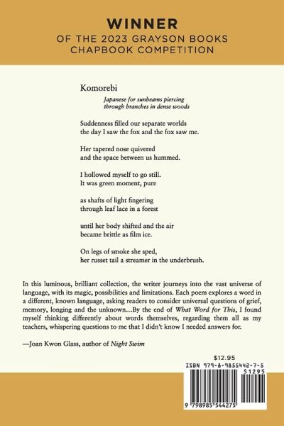 Each poem in What Word for This explores a word from another language that expresses something we have no term for in English. Certainly language shapes our experience even as it attempts to express it. In these luminous poems, Marion Boyer explores myriad human experiences of time, space, memory, longing, and the ineffable.
