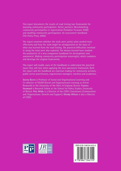 A document of the results of road-testing two frameworks for assessing community participation: Active partners: Benchmarking community involvement in regeneration (Yorkshire Forward, 2000) and Auditing community participation: An assessment handbook (The Policy Press, 2000).