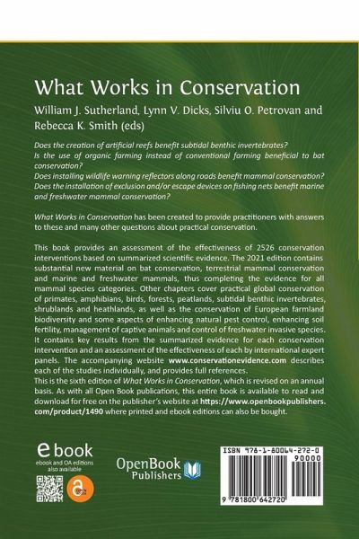 Does the creation of artificial reefs benefit subtidal benthic invertebrates? Is the use of organic farming instead of conventional farming beneficial to bat conservation? Does installing wildlife warning reflectors along roads benefit mammal conservation? Does the installation of exclusion and/or escape devices on fishing nets benefit marine and freshwater mammal conservation? What Works in Conservation has been created to provide practitioners with answers to these and many other questions about practical conservation. This book provides an assessment of the effectiveness of 2526 conservation interventions based on summarized scientific evidence. The 2021 edition containssubstantial new material on bat conservation, terrestrial mammal conservation and marine and freshwater mammals, thus completing the evidence for all mammal species categories. Other chapters cover practical global conservation of primates, amphibians, bats, birds, forests, peatlands, subtidal benthic invertebrates, shrublands and heathlands, as well as the conservation of European farmland biodiversity and some aspects of enhancing natural pest control, enhancing soil fertility, management of captive animals and control of freshwater invasive species. It contains key results from the summarized evidence for each conservation intervention and an assessment of the effectiveness of each by international expert panels. The accompanying website www.conservationevidence.com describes each of the studies individually, and provides full references. This is the fourth author-approved edition of What Works in Conservation, which is revised on an annual basis.