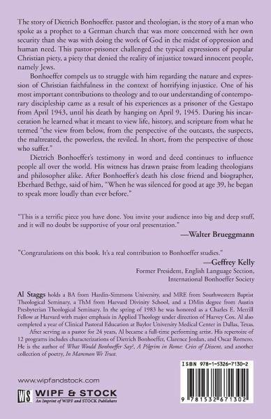 The story of Dietrich Bonhoeffer. pastor and theologian, is the story of a man who spoke as a prophet to a German church that was more concerned with her own security than she was with doing the work of God in the midst of oppression and human need. This pastor-prisoner challenged the typical expressions of popular Christian piety, a piety that denied the reality of injustice toward innocent people, namely Jews. Bonhoeffer compels us to struggle with him regarding the nature and expression of Christian faithfulness in the context of horrifying injustice. One of his most important contributions to theology and to our understanding of contemporary discipleship came as a result of his experiences as a prisoner of the Gestapo from April 1943, until his death by hanging on April 9, 1945. During his incarceration he learned what it meant to view life, history, and scripture from what he termed ""the view from below, from the perspective of the outcasts, the suspects, the maltreated, the powerless, the reviled. In short, from the perspective of those who suffer."" Dietrich Bonhoeffer's testimony in word and deed continues to influence people all over the world. His witness has drawn praise from leading theologians and philosopher alike. After Bonhoeffer's death his close friend and biographer, Eberhard Bethge, said of him, ""When he was silenced for good at age 39, he began to speak more loudly than ever before.""