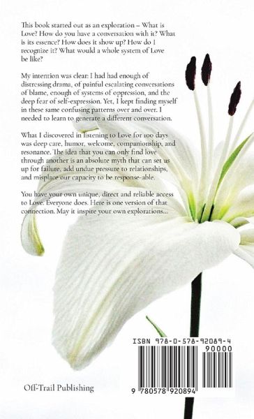 This book started out as an exploration - What is Love? How do you have a conversation with it? What is its essence? How does it show up? How do I recognize it? What would a whole system of Love be like? My intention was clear: I had had enough of distressing drama, of painful escalating conversations of blame, enough of systems of oppression, and the deep fear of self-expression. Yet, I kept finding myself in these same confusing patterns over and over. I needed to learn to generate a different conversation. What I discovered in listening to Love for 100 days was deep care, humor, welcome, companionship, and resonance. The idea that you can only find love through another is an absolute myth that can set us up for failure, add undue pressure to relationships, and misplace our capacity to be response-able. You have your own unique, direct and reliable access to Love. Everyone does. Here is one version of that connection. May it inspire your own explorations...