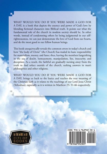 WHAT WOULD YOU DO IF YOU WERE MADE A GOD FOR A DAY, is a book that depicts the essence and power of God's love by blending fictional characters into Biblical truth. It points out what the fundamental role of the church in modem society should be. In other words, instead of condemning others by being judgmental in our self-righteousness, we can just demonstrate the love of God from our hearts, and do the most good to our fellow human beings. This book unequivocally reveals the common errors in today's church and how "the body of Christ" (the Church) has traded its basic responsibility for materialism, money, and fame; thus, leaving the members languishing in the sea of doubt, bemusement, manipulation, lies, insecurity, and deception. As a result, the faithful are gradually turning away from the truth to find solace outside of the church, seeking answers in man's philosophies and other religions. WHAT WOULD YOU DO IF YOU WERE MADE A GOD FOR A DAY, brings us back to the basics and teaches the true meaning of the Christian faith as it relates to the teachings of our Lord Jesus Christ (Yehoshua), especially as it is written in Matthew 25: 31-46 respectively.