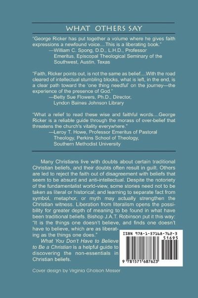 Many Christians live with doubts about certain traditional Christian beliefs, and their doubts often result in guilt. Others are led to reject the faith out of disagreement with beliefs that seem to be absurd and anti-intellectual. Despite the notoriety of the fundamentalist world-view, some stories need not to be taken as literal or historical; and learning to separate fact from symbol, metaphor, or myth may actually strengthen the Christian witness. Liberation from literalism open the possibilities for greater depth of meaning to be found in what have been traditional beliefs. Bishop J.A.T. Robinson put it this way; "It is the things one doesn't have to believe, and finds one doesn't have to believe, which are truly liberating as the thingds one does." "What You Don't Have to Believe to Be a Christian," is a helpful guide to discovering the non-essential in Christian beliefs.