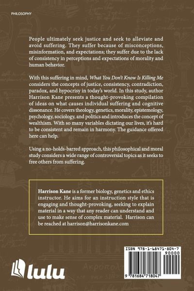 What You Don't Know Is Killing Me is about justice, consistency, contradiction, paradox, and hypocrisy in today's world. It is a very thought-provoking compilation of what causes individual suffering and cognitive dissonance. Several concepts are accurately and intensely covered, including but not limited to: Theology, Genetics, Morality, Epistemology, Psychology, Sociology, and Politics. Harrison introduces the term and concept "Wealthism". What You Don't Know Is Killing Me takes a "no-holds barred" approach in addressing these controversial topics. There are several novel and "adversarial" positions that are addressed eloquently.