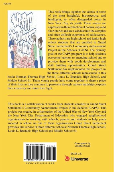This book brings together the talents of some of the most insightful, introspective, and intelligent, yet often disregarded voices in New York City, its youth. These voices are expressed in this collection of poems, raps and short stories and are a window into the complex and often difficult experience of adolescence. These authors are high school and junior high school students that are enrolled in Grand Street Settlement's Community Achievement Project in the Schools (CAPS). The primary goal of the CAPS program is to help students overcome barriers to attending school and to provide them with youth development and skill building opportunities. Grand Street Settlement has implemented this program in the three different schools represented in this book; Norman Thomas High School, Louis D. Brandeis High School, and Middle School 61. These young people have come together to share a piece of their lives as they continue to persevere through various hardships, express their creativity and shine their light.