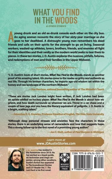 A young drunk and an old ex-drunk console each other on the city bus. An aging woman recounts the story of her sixty-year marriage as she goes to her deathbed. A distraught young man remembers his dead friends and calls on their spirits for the strength to go on living. Seasonal workers, washed-up athletes, lovers, brothers, friends, and enemies all fight for their identities and their sanity as the modern world seeks to tear them to pieces. In these ten stories, J. D. Austin explores the nuances, pitfalls, failures, and redemptions of men and their families in the Upper Midwest.* * * "J. D. Austin's book of short stories, What You Find in the Woods, stands as another proof of his amazing talent. His stories come to the reader as gritty and authentic as real life. Through his broken characters, he imparts age-old wisdom set within the homey and raw landscape of the northern Midwest. These stories take us into the minds of young men and women who live within the purgatory of becoming broken." - Sue Harrison, international bestselling author of The Midwife's Touch "These are stories Jack London might have written, if Jack London had been an opiate-addled ex-hockey player. What You Find in the Woods is about how we grieve, and how death surrounds us wherever we are. Throw in a car chase and a couple of beer jags and you have the literary equivalent of gelignite. Austin reminds us of the importance of homemade grilled cheese in nursing homes, of the dangers of the 'day-murdering nap,' and the fact that nobody's free until the day after they die. These are powerful stories that Hemingway himself would have been proud to have written: they have the same coiled energy as 'The Killers' and 'A Clean, Well-Lighted Place.' What You Find in the Woods does for the Upper Peninsula what Knockemstiff did for Ohio: Jack Austin is a bright, scathing talent." - Sebastian D. G. Knowles, Professor Emeritus of English, The Ohio State University "Jack Austin's new short-story collection, What You Find in the Woods, offers a diverse set of tales, some short, some really novel¬las, that reflect the grittier side of life in Upper Michigan, especially for young millennial men seeking to survive while coping with issues like loneliness, heartbreak, and alcoholism. Austin creates realistic dialogue and even more realistic characters as he delves into the intricacies of the human experience, trying to make sense out of a world where sometimes we are our own worst enemies." - Tyler R. Tichelaar, PhD, award-winning author of The Mysteries of Marquette "...with his two opening stories plus the powerful titular story set midway-even though poor Jake was a goalie in hockey-Austin scores a 'hat trick' for the book. Well-made and exciting stories. And we will like his characters. He is a good weaver of fiction seasoned with just a touch of humor. I think Jack Austin is grooming himself for some very fine writing. He is quickly becoming the Yooper's answer to Tom Wolfe. Read him." - Donald M. Hassler, Professor Emeritus of English, Kent State University "Although deep personal stresses and anxieties face the characters in these stories, there is an underlying sense of camaraderie and love that suggests hope. This a strong follow-up to the first novel of a promising young author." - Jon C. Stott, author of Paul Bunyan in Michigan Learn more at jdaustinstories.com
