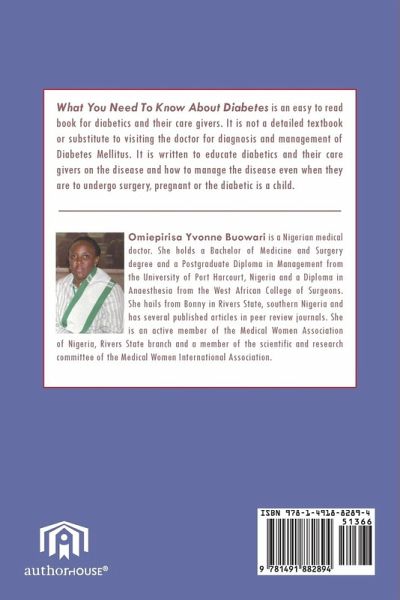What You Need to Know about Diabetes is an easy to read book for diabetics and their care givers. It is not a detailed textbook or substitute to visiting the doctor for diagnosis and management of Diabetes Mellitus. It is written to educate diabetics and their care givers on the disease and how to manage the disease even when they are to undergo surgery, pregnant or the diabetic is a child.