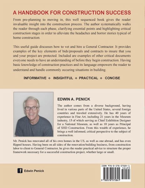 A concise workbook on how to plan a small or large construction project from pre-planning to finishing, this well sequenced book gives the reader invaluable insight through the entire construction process. The book systematically walks the reader through and explains each phase, clarifying essential points and highlighting critical phases creating a proper framework to alleviate the headaches and horror stories of home construction. Having basic knowledge of construction practices and its language empowers the reader to understand and handle situations that commonly occur. This useful guide familiarizes the reader with the various phases of construction and its language; providing examples of all the critical documents everyone needs to have an understanding of before they begin construction to insure that you and your project are protected. Along the way giving the reader some helpful tips on how to hire the right general contractor for the job. The author provides practical advice that creates a proper foundation for construction success.