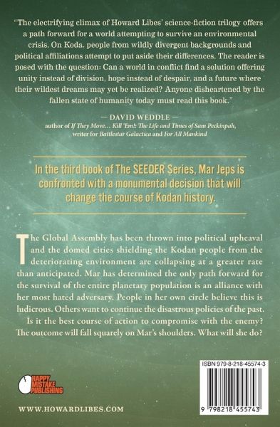 In the third book of The SEEDER Series, Mar Jeps is confronted with a monumental decision that will change the course of Kodan history. The Global Assembly has been thrown into political upheaval and the domed cities shielding the Kodan people from the deteriorating environment are collapsing at a greater rate than anticipated. Mar has determined the only path forward for the survival of the entire planetary population is an alliance with her most hated adversary. People in her own circle believe this is ludicrous. Others want to continue the disastrous policies of the past. Is it the best course of action to compromise with the enemy? The outcome will fall squarely on Mar's shoulders. What will she do?
