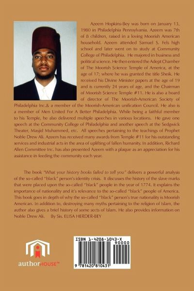 The book "What your history books failed to tell you" delivers a powerful analysis of the so-called "black" person's identity crisis. It discusses the history of the slave marks that were placed upon the so-called "black" people in the year of 1774. It explains the importance of nationality and it's relevance to the so-called "black" people of America. This book goes in depth of why the so-called "black" person's true nationality is Moorish American. In addition to, destroying many myths pertaining to the religion of Islam, the author also gives a brief history of some sects of Islam. He also provides information on Noble Drew Ali. By Sis. ELISA HERDER-BEY