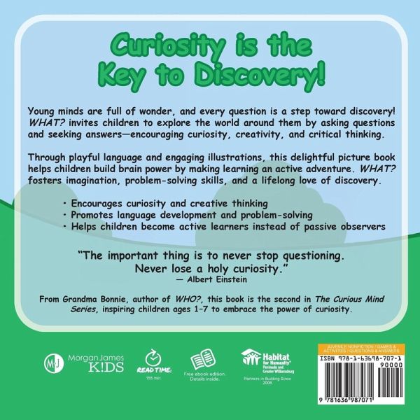 WHAT? invites young children to build brain power by actively engaging with their own learning through creative questioning and investigation. Watch the world open up in unexpected ways through the power of a curious mind. "The important thing is to never stop questioning. Never lose a holy curiosity." -Albert Einstein