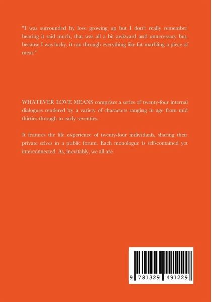"I was surrounded by love growing up but I don't really remember hearing it said much, that was all a bit awkward and unnecessary but, because I was lucky, it ran through everything like fat marbling a piece of meat." WHATEVER LOVE MEANS comprises a series of twenty-four internal dialogues rendered by a variety of characters ranging in age from mid thirties through to early seventies. It features the life experience of twenty-four individuals, sharing their private selves in a public forum. Each monologue is self-contained yet interconnected. As, inevitably, we all are.