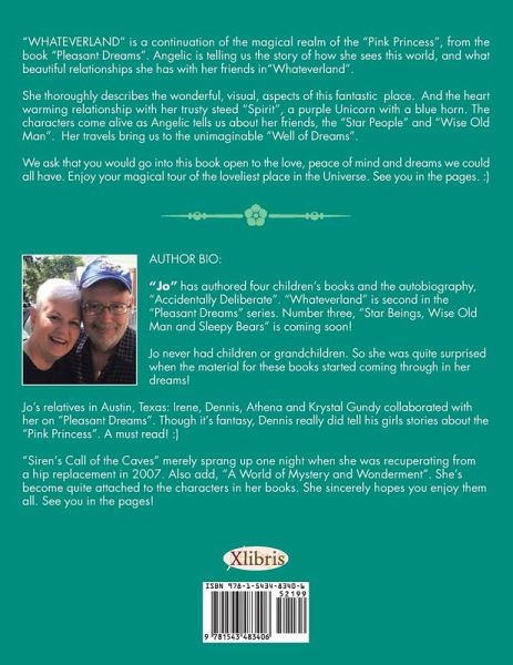 WHATEVERLAND is a continuation of the magical realm of the Pink Princess, from the book Pleasant Dreams. Angelic is telling us the story of how she sees this world, and what beautiful relationships she has with her friends inWhateverland. She thoroughly describes the wonderful, visual, aspects of this fantastic place. And the heart warming relationship with her trusty steed Spirit, a purple Unicorn with a blue horn. The characters come alive as Angelic tells us about her friends, the Star People and Wise Old Man. Her travels bring us to the unimaginable Well of Dreams. We ask that you would go into this book open to the love, peace of mind and dreams we could all have. Enjoy your magical tour of the loveliest place in the Universe. See you in the pages. :)